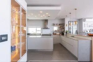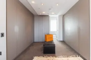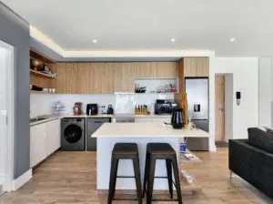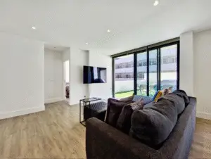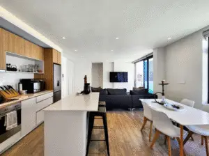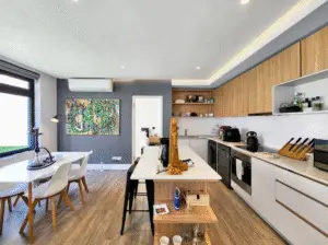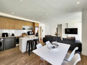 and relaxation. The open-plan kitchen and living area are designed with sleek, high-end finishes and state-of-the-art